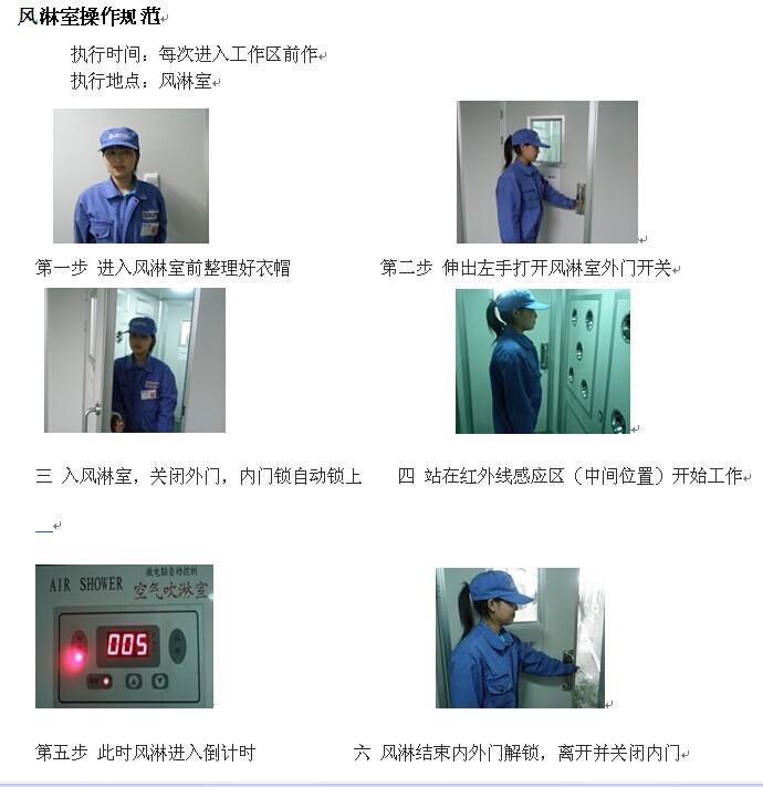 依風(fēng)淋室作業(yè)標(biāo)準(zhǔn)書進(jìn)行正確使用,避免違規(guī)操作,如:不能隨意更改風(fēng)淋室設(shè)定的各項(xiàng)參數(shù);在正常工作模式下,切勿強(qiáng)迫開關(guān)風(fēng)淋門,不能觸動(dòng)任何控制開關(guān);風(fēng)淋前后,輕開輕關(guān)風(fēng)淋門;發(fā)生故障時(shí),不要慌,最好不要啟動(dòng)手動(dòng)按鈕,請(qǐng)及時(shí)通知專業(yè)人員來(lái)處理。